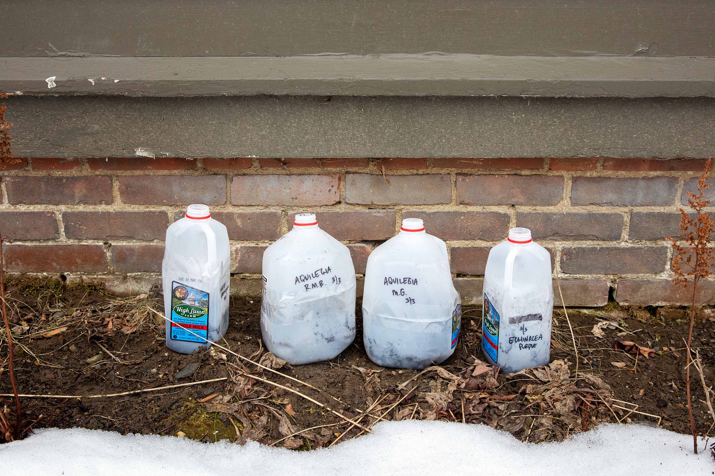 Nature will provide snow, rain, and freezing temperatures. Inside the jug, the seeds will experience the natural freeze-thaw cycle that tells them spring is coming.