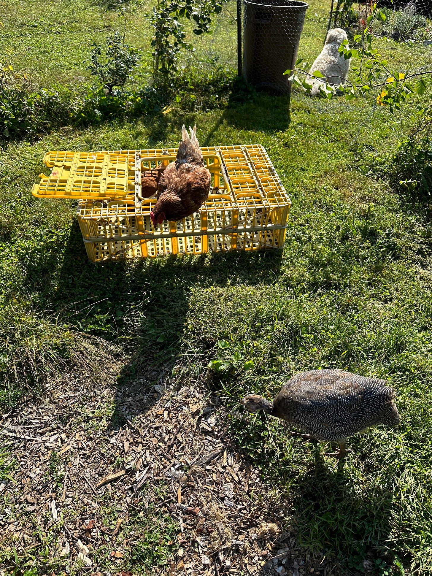 Her name was Fi, and she carried on alone in the yard. We felt bad for her. A single guinea screaming to herself did not feel like the thriving poultry democracy we had envisioned. So we drove to a friend’s poultry farm in New York and returned with two chickens: Hen Affleck and Chickolas Cage, names that implied a kind of gravitas the situation absolutely did not have.