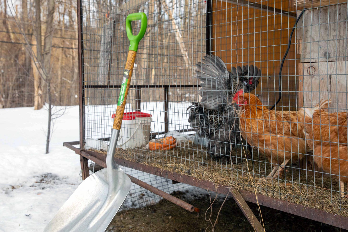 He looked at the shovel. He looked at the hens. He looked at me. He crowed once, and it sounded like a question.