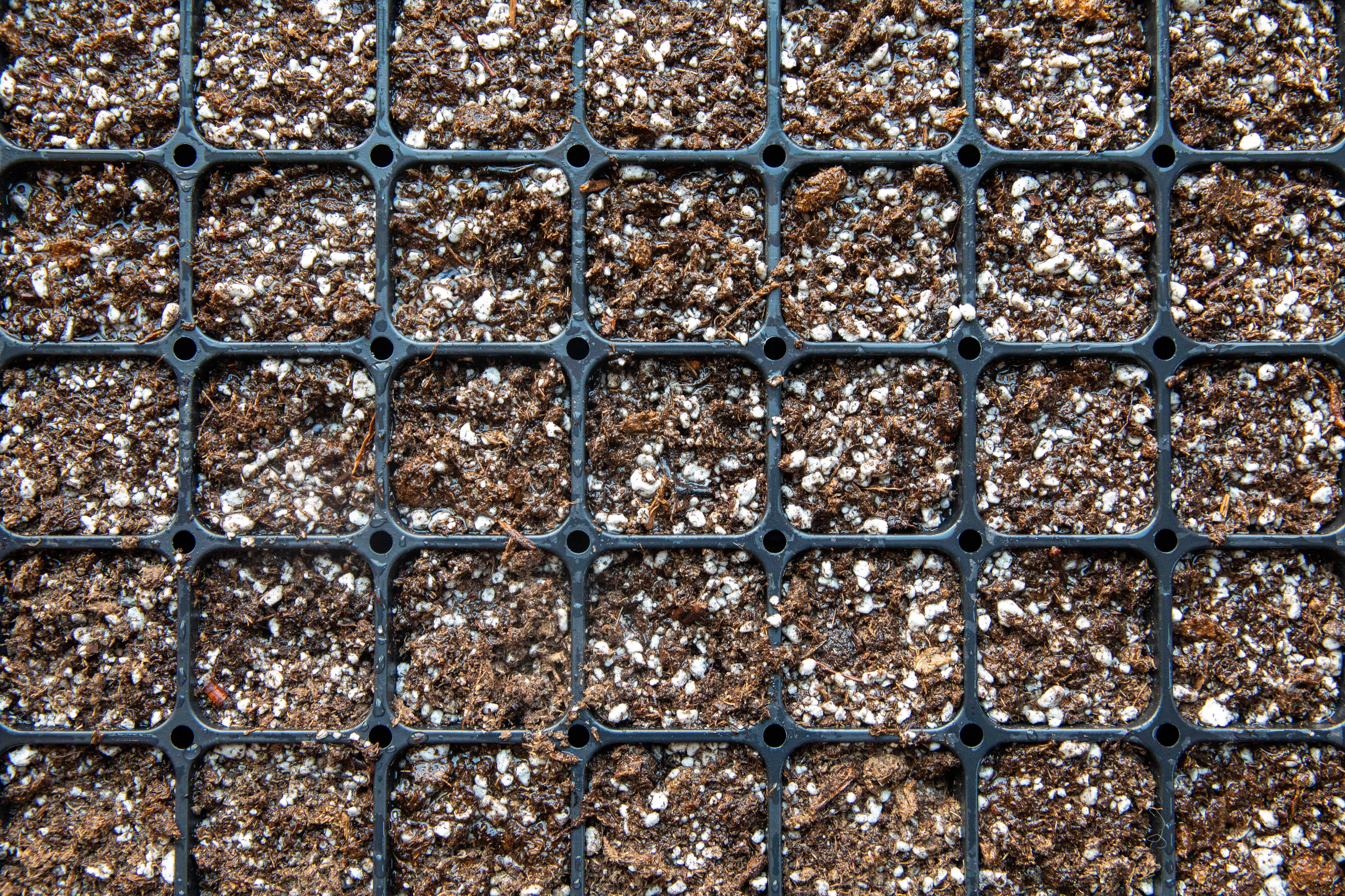 Fill the cells with soil. Tap them lightly on the table like you’re calling a very dusty meeting to order.