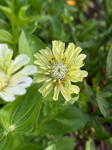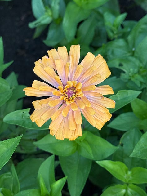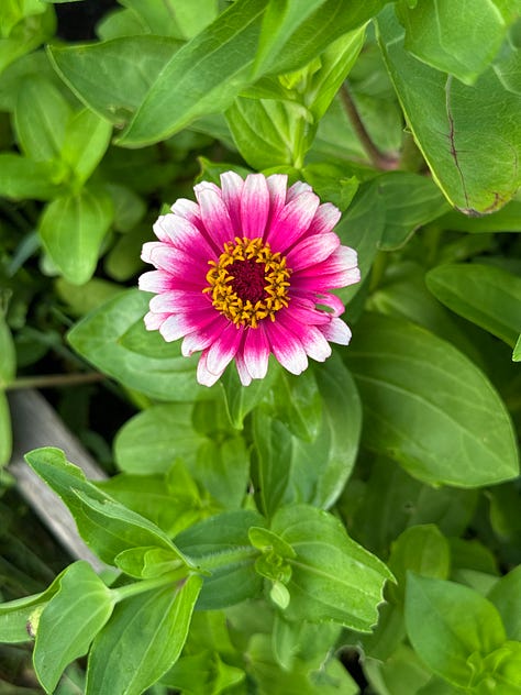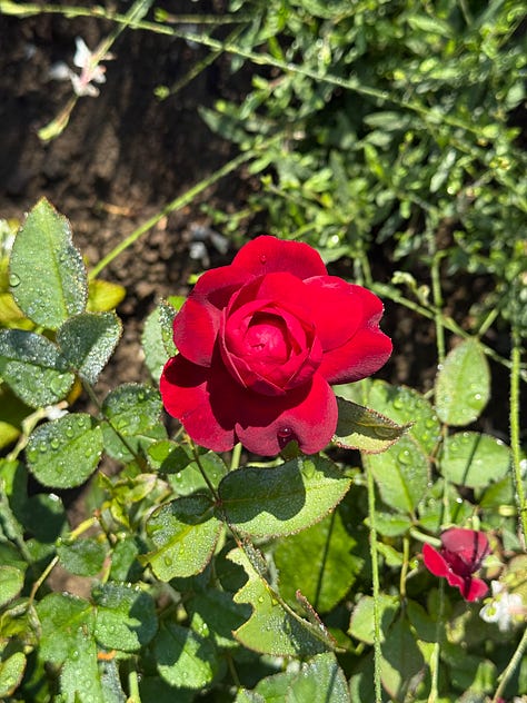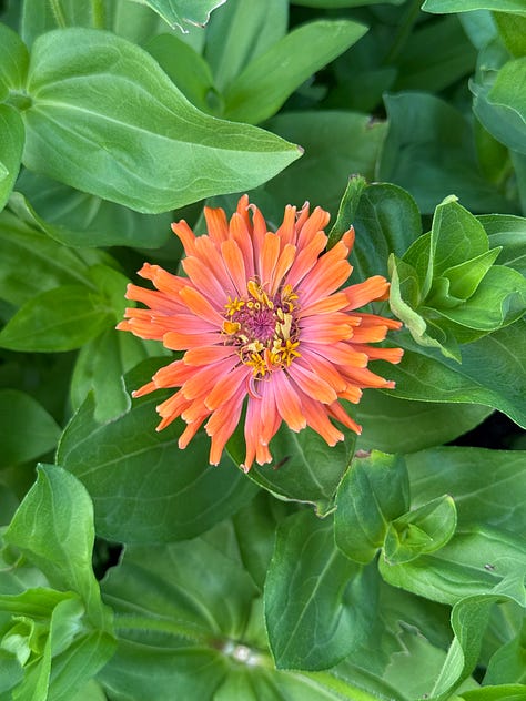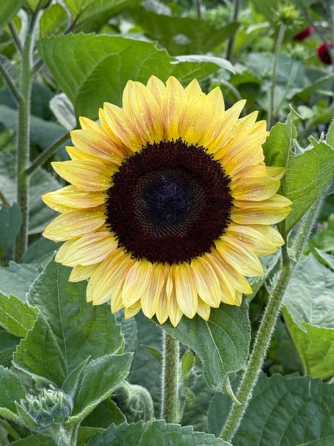 Blooming: Zinnias—my god, the zinnias!—leading the charge in my garden’s maximalist phase. My first sunflower cracked open this week, tall, self-important, and golden as a cult leader’s aura. Rosa ‘Darcey Bussell’ is a rose in a red velvet bra, too gorgeous to trust, too fragrant to resist.