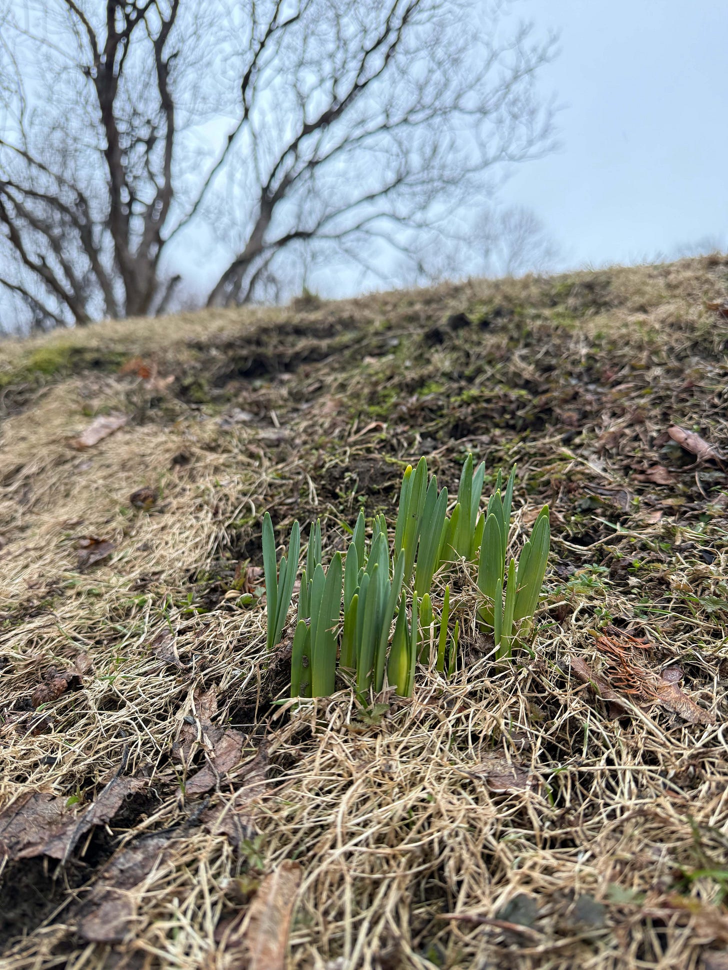 Back in the yard, I almost stepped on it: a small green cluster of daffodils pushing up through the hill, not where anything should have been growing yet. The soil still heavy, matted, holding the shape of winter. Dead grass pressed in on all sides like it hadn’t gotten the memo.