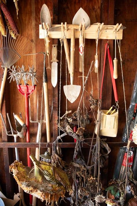 Later, I rubbed the heads over a sheet pan, let the seeds fall like confetti, and left them to dry a few days more before storing. My preferred method of storage is to stuff them into cute lil envelopes labeled with something slightly deranged like “I am great at saving money! (Love-in-a-Mist ‘Miss Jekyll’),” or “love2hoe@aol.com (‘Valkyrie’ Zinnias),” or “My life is chaos! (Sunflower mix),” and keep them in a shoebox in the basement. Cool, dark, and dry is the name of the game—just like last week's post on corms and tubers.