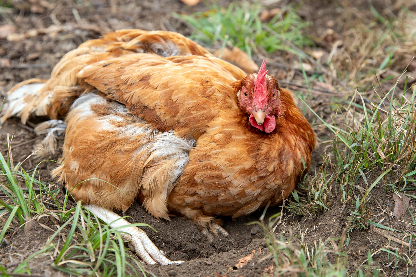 There’s a spot by the southwest corner of the run where the hens have hollowed out a shallow pit—a sunken temple, really. Every afternoon they gather there as if summoned by forces older than time, and commence the ritual: flop, roll, flutter, transcend. They writhe in slow motion, tossing dust through their feathers. If you’ve ever wondered what spa day on MDMA looks like for a creature with a brain the size of a walnut, it’s this.