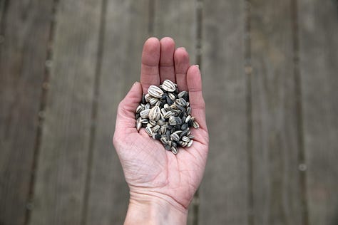 I grew over ten varieties of sunflower this year, all of which thrived. I waited until the backs of the heads turned from green to papery brown and the seeds felt firm to the touch. I cut them before they dried completely on the stalk—since I was up against the neighborhood birds—and hung them in my “gardening shed” (my side of the garage).